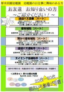 現在、厚木田園幼稚園では各種職員の募集をしています!