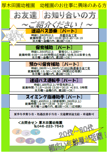 厚木田園幼稚園 046-223-7543(担当:山口・池野・鹿島)